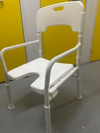 Silla de baño plegable y regulable, diseñada para ofrecer comodidad y seguridad. - Estructura resistente. - Asiento con diseño ergonómico. - Patas ajustables en altura. - Reposabrazos para mayor soporte.