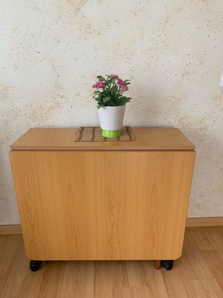 Mesa versátil que se adapta a tus necesidades, ideal para la cocina o el salón. Su diseño funcional la hace práctica para el día a día. - Patas con ruedas para fácil movilidad. - Acabado en tonos madera natural. - Diseño plegable para ahorrar espacio. - Sillas integradas en buen estado(4 unidades). INCLUIDO EN EL PRECIO - Cajon de almacenaje Medidas de la mesa cerrada: Alto 76 cm Fondo 30 cm Ancho 86 cm Abierta completa mide 160 cm de largo x 86 cm de ancho Abriendo solo una ala: 97 cm de largo x 86 cm de ancho Por favor, revisar las imperfecciones destacadas en las fotos. NO HAGO ENVÍOS
