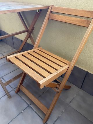 Mesa plegable de madera, ideal para espacios exteriores como terrazas o balcones. Su diseño permite guardarla fácilmente. - Fabricada en madera. - Estructura plegable. Se incluye la mesa y una silla. Recogida en Getafe