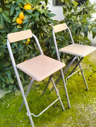 Se venden dos taburetes altos plegables. Son de madera y metal, con un diseño sencillo y elegante. Están como nuevos. - Ideales para cocina o barra de bar. - Plegables para facilitar su almacenamiento. - Asiento cuadrado de madera. Con reposapiés.