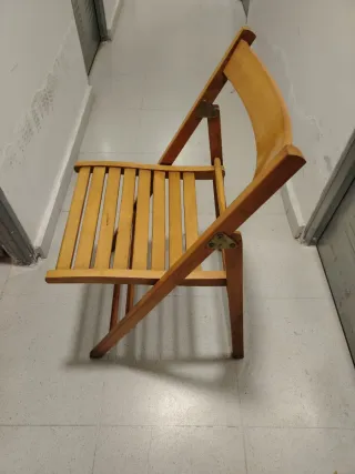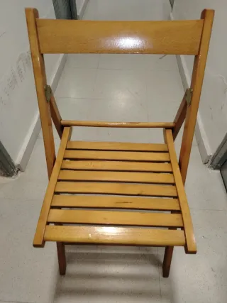 Silla plegable de madera con un diseño clásico y funcional. - Estructura robusta de madera. - Asiento y respaldo de listones de madera. Dispongo de otra silla parecida en mi perfil.