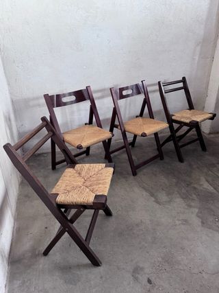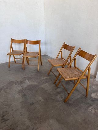 Conjunto de cuatro sillas plegables con un diseño natural y ligero. Perfectas para añadir un toque acogedor a cualquier espacio. u/€ - Estructura de madera. - Asiento y respaldo de rattan tejido