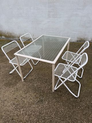 Conjunto de mesa y cuatro sillas plegables, ideal para exteriores. La estructura es de metal blanco y el tablero de la mesa es de cristal con un diseño de rejilla. - Mesa con tablero de cristal. - Cuatro sillas plegables. - Estructura metálica blanca.