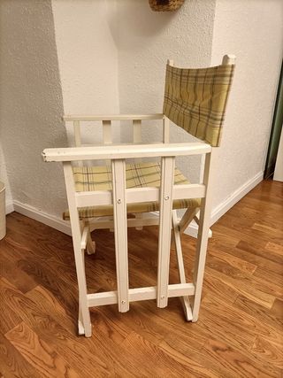 Sillas vintage estilo DIRECTOR. Plegables de madera lacada en blanco. De los 80's. La tela de loneta está recién renovada. Ideal para ambientes juveniles, terrazas, jardín, como asiento auxiliar para invitados....etc. Hay dos unidades. El precio es por unidad.