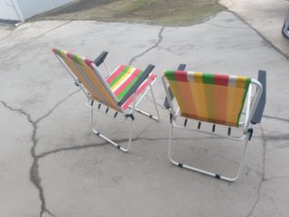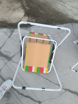 Silla plegable ideal para acampar o llevar a cualquier sitio. Está en buen estado y es perfecta para relajarse al aire libre. - Plegable para facilitar su transporte y almacenamiento. - Cómoda y resistente. Se vende 5 y se regala una que está un poco más deteriorada la tela.
