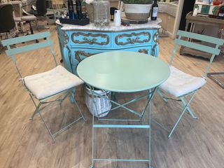 Conjunto de mesa y sillas plegables, ideal para terraza o jardín. El diseño es moderno y funcional. MEDIDAS MESA ANCHO 60 ALTO 70 Sillas ancho 40 alto 43 - Mesa redonda. - Dos sillas con cojines. - Estructura metálica.