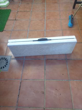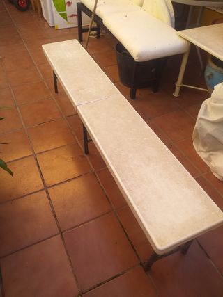 Banco plegable, de hierro forjados y PVC con tres patas, de color blanco, medidas abierto largo 1'83 ,cerrado maleta 0'91,alto 0'44 y ancho 0'30, en buen estado y buen precio, se vende tal como está