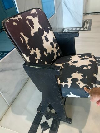 Silla plegable con un diseño único de tela con estampado de vaca. - Estructura de madera. - Tapicería de tela.