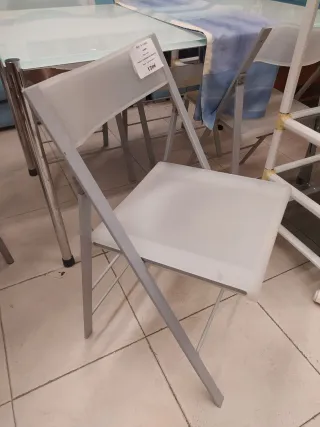 Silla plegable con un diseño moderno y funcional. - Estructura de metal. - Asiento y respaldo de plástico. - Color gris y blanco. Galerías 66 Reus Av St Bernat Calbó 35-37 Tienda de segunda mano y ocasión