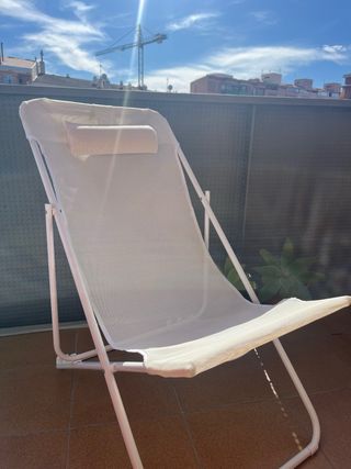 Hamaca plegable de color blanco, ideal para exteriores. -Tres posiciones de respaldo. -Ocupa muy poco espacio plegada. -Cojín incorporado. - Estructura metálica. - Tejido de malla transpirable y lavable.