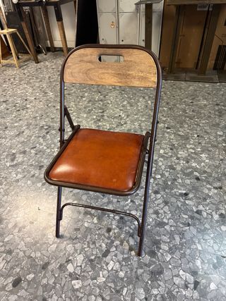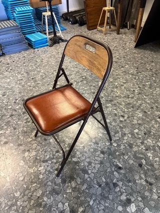 Silla plegable con un diseño elegante y materiales de calidad. En perfectas condiciones y con una antigüedad entre 40 ó 50 años, guardados en un baúl con más de cien años. - Asiento y respaldo de tiras de cuero. - Estructura de madera.