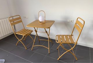 Conjunto de mesa y sillas plegables para tu terraza o balcón. Ideal para disfrutar del aire libre. - Estructura metálica resistente. - Diseño moderno y funcional.