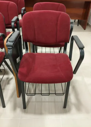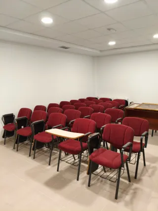 Conjunto de sillas granates con mesa abatible, ideales para espacios de formación o conferencias. El diseño permite optimizar el espacio y la comodidad. - Asientos y respaldos tapizados en tela - Mesa auxiliar de madera resistente integrada - Estructura metálica en color negro - Cajonera bajera - Casi sin uso, en perfecto estado - 30 unidades (60€/ unidad)