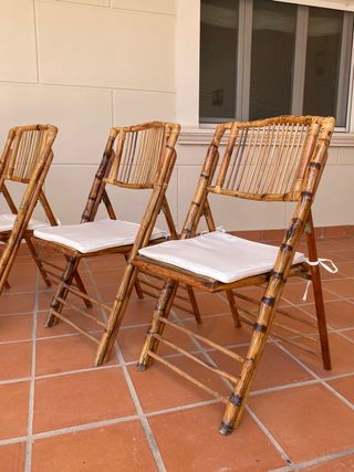 Sillas de bambú con cojín y funda desmontable para lavar. Una de ellas tiene agrietada la madera y un palito de abajo roto, pero no afecta a su uso. Son plegables y recogidas ocupan muy poco. Precio por unidad. Son de bambú naturales y por lo tanto no muy resistentes. Tengo 8 unidades NO NEGOCIABLE