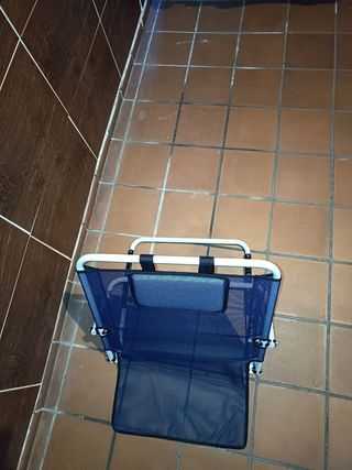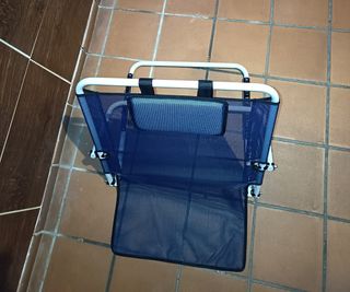 Se vende respaldo plegable para silla, ideal para mayor comodidad. Es ligero y fácil de transportar. - Estructura de metal resistente. - Tela de malla azul marino. - Incluye cojín para la cabeza. - Plegable para fácil almacenamiento.
