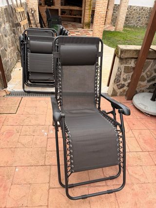 Conjunto de 4 reposeras plegables, perfectas para exteriores. - Estructura de metal resistente. - Asiento y respaldo de tela. - Reposacabezas acolchado. - Diseño ergonómico. Comprado en junio del 25 En MAKRO