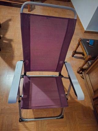 Preciosa silla de playa plegable, ideal para disfrutar del buen tiempo. Es ligera y fácil de transportar. - Estructura de metal. - Tejido de color morado. - Perfecta para la playa o el jardín. Lo único qe tiene es en un posabrazo unas peqeñas marcas como de quemado pero son muy peqeñas y apenas se aprecia . El resto en perfecto estado