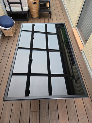Elegante mesa de exterior con superficie de cristal y estructura metálica. Tanto la mesa como las sillas son plegables (son 4 sillas iguales, solo sale 1 en la foto porque las otras las tengo guadadas en un baul). Las medidas de la mesa es de 80x130 ancho por largo. Fue comprada en bricor y ha dado muy buen resultado, tiene algun q otro picotazo en las partes metálicas, nada del otro mundo y nada q salte a la vista de primeras, si te fijas si q se ven fácil. - Diseño moderno. - Patas metálicas en forma de X.