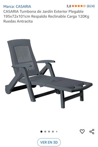 Son 2 Tumbonas, 95€ cada una. Creo que se puede enviar al ser plegable no ocupa tanto. Preciosa tumbona de jardín CASARIA, ideal para relajarse al aire libre. Es de plástico resistente y color gris antracita. En su embalaje original, descatalogadas. - Medidas: 195x72x101cm - Respaldo reclinable - Carga máxima: 120Kg - Incluye ruedas para facilitar su transporte - Perfecta para terrazas y jardines Amaca, verano, decoración, mueble exterior, piscina, playa