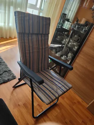 Vendo silla plegable, ideal para jardín, terraza o balcón. Es muy cómoda gracias a su respaldo alto y al cojín acolchado con diseño de rayas (azul y marrón). Características: Reclinable en varias posiciones y totalmente plegable para que no ocupe espacio al guardarla.