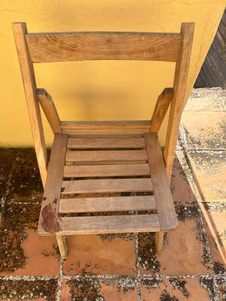 Se venden cuatro sillas plegables de madera de teca para exterior. Son perfectas para jardín o terraza. - Ideales para espacios pequeños, ya que se pliegan fácilmente. - Presentan un aspecto ligeramente desgastado por el sol, pero la estrucura esta perfecta. Solo hace falta barnizarlas.