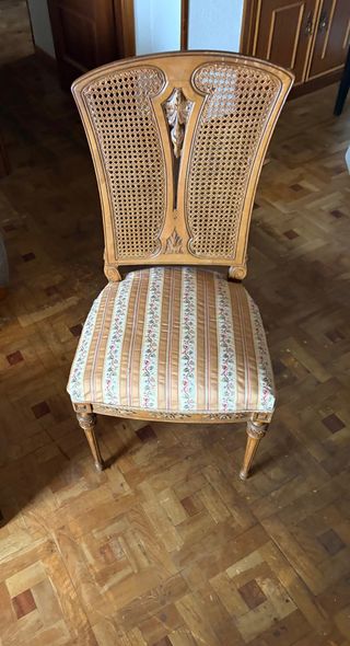 Conjunto de 6 sillas de madera con detalles de ratán y tapicería. - Diseño clásico y elegante. - Respaldo con entramado de ratán. - Asiento tapizado con - estampado floral.