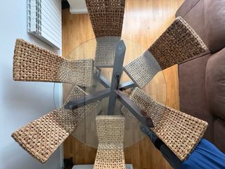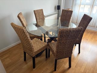 Conjunto de mesa de comedor con sobre de cristal y seis sillas de ratán. - Mesa con base de madera oscura. - Sillas de ratán tejidas a mano. - Diseño moderno y elegante. Dimensiones mesa 135 cm diámetro y 77 cm alto. Dimensiones de Sillas 105 cm alto y 45 cm ancho *Una de las patas de la mesa tiene un desconchón, adjunto detalle en fotos.