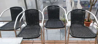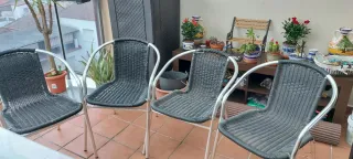 Conjunto de cuatro sillas de terraza con un diseño moderno y cómodo. - Estructura de aluminio plateado, no pesan y se pueden apilar. - Asiento y respaldo de ratan negro. En muy buen estado ideal para terraza, patio o casa de campo. Recoger en mi domicilio