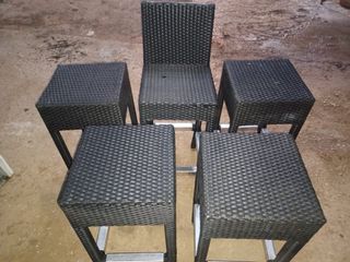 Set de banquetas altas con un diseño moderno y elegante. Perfectas para barras o mesas altas. - Estructura de metal resistente. - Revestimiento de ratán sintético. - Acabado en color negro y plateado. 40€ unidad