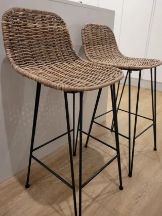 Conjunto de dos taburetes altos con un diseño moderno y natural. - Asiento tejido en ratán. - Patas finas de metal negro. La altura de 90 cm indicada es con el respaldo. Etiquetas: Sklum, Kave home, Zara home, Tikamoon, Maison du monde, kenay home