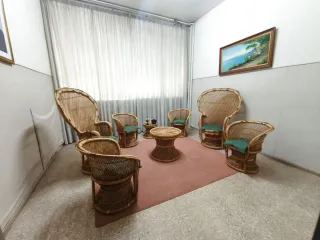 Conjunto de sillas de comedor con un diseño elegante y materiales de calidad retapizadas el año pasado. Actualmente dispongo de 48 Sillas Y 17 sillones. Sillas a 30€ Sillones a 35€ - Estructura de ratán resistente. - Asiento tapizado en tela. - Combinación de colores beige y negro.