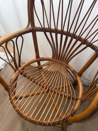 Elegante silla vintage de ratán con un diseño único en forma de abanico. - Material natural y resistente. - Tonos cálidos que combinan con cualquier decoración. - Estructura tejida a mano. Con algunos signos de desgaste por uso y tiempo sigue siendo robusta para una segunda vida. Rebajas bolso comunion, gala,bautizo,evento,trabajo, oficina, boda,mobles,regalo comunión,fashion,glamour,decoracion,decoración,cocina habitacion, habitación,decora, fotografia,foto,ikea,luz,bombilla,casa, salón,dormitorio,terraza,jardin, despacho,piso,mudança anticuario retro flor,reforma,cadira,cadires,pis,silla mueble terrassa balcó exterior butaca