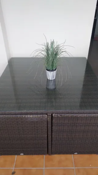 Mesa de exterior con un diseño moderno y elegante. Perfecta para disfrutar de tus espacios al aire libre. - Superficie de cristal. - Mesa, sillas y cajon de ratán. En las fotos las cojines no tienen la funda puesta, pero están guardadas y bien conservadas, también incluye las 4 sillas, el cristal y los 4 cajones que van debajo de la silla. Mide 120×120cm (un cuadrado perfecto) y de altura 75cm PRECIO NEGOCIABLE