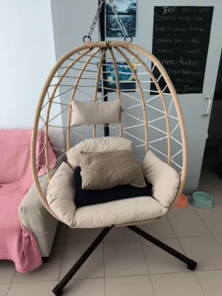 Este sillón colgante es perfecto para tu terraza o jardín. Su diseño moderno y materiales de calidad lo hacen ideal para disfrutar del aire libre. - Estructura de ratán. - Cojines cómodos. - Base metálica resistente. Apenas se ha usado, los cojines son desenfundables Se mojo x la lluvia y al ser natural algunos cordones del columpio se deshicieron pero las cuerdas están intactas Precio real 295€