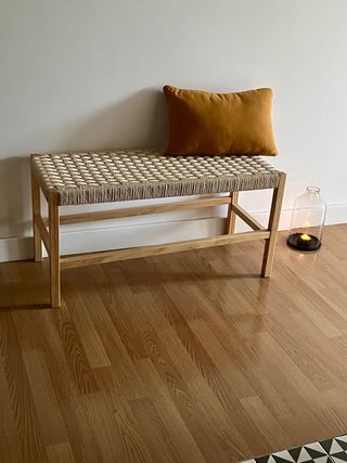 Banco de diseño con estructura de madera y asiento tejido en rafia. - Acabado natural. - Ideal para recibidor, pasillo o pie de cama. Está impecable, comprado hace dos meses. Como nuevo. Precio original 79,99 €. 90x38x45cm