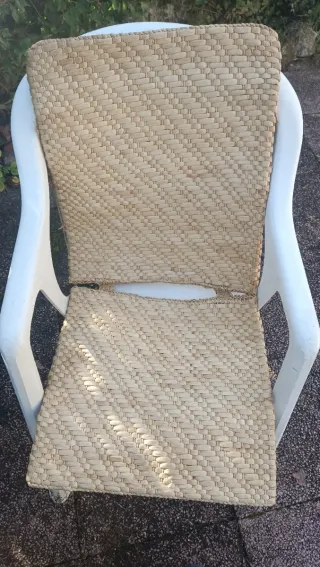 Funda para asiento y respaldo de silla, tejida en ratán, reversible. Medidas: Asiento : 45 x 42 Respaldo : 45 x 50 Diseño con motivos geométricos. Aporta un toque natural y cálido. 1 Nuevo 6 € 1 con ligeras rozaduras 5 € Los 2 : 10 €