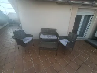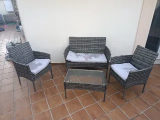 2 sillas, un sofá y una mesa. Muy buena condición. Apenas usado. Las manchas mojadas que se ven en las fotos son de la lluvia. Fotos 4 y 5: medidas de las sillas Fotos 6-8: medidas de la mesa Última foto: medida del sofá
