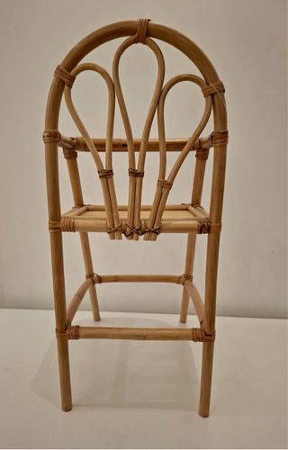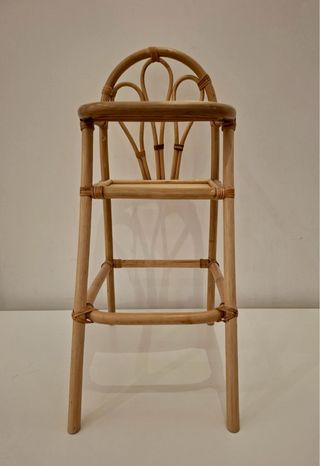 Silla alta de juguete fabricada en ratán. - Material: Ratán natural. - Diseño: Estructura de ratán con respaldo curvo y reposapiés. Dimensiones: 23 x 30 x altura 54 cm. Asiento: 20 x 13 x altura 24 cm.