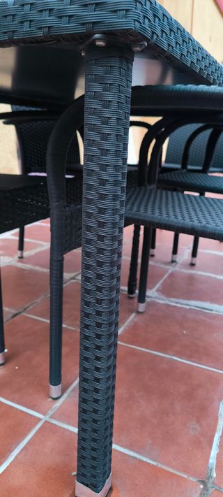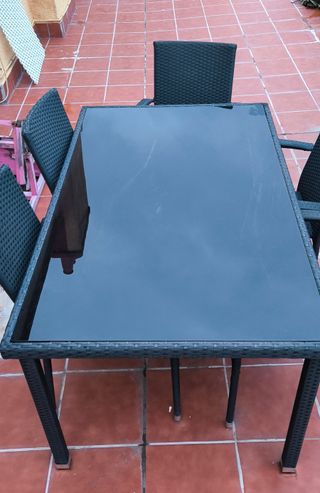 Conjunto de muebles de exterior con mesa de cristal y sillas. Ha estado durante unos 5 años en una terrraza sin tejado que la cubra, pero con funda protectora. Se nota el uso, pero sigue cumpliendo su función. - Dimensiones de la mesa: 90cm ancho x 150cm largo x 70cm alto - Dimensiones de las sillas: 61cm ancho x 55cm largo x 89cm alto - Mesa rectangular con sobre de cristal - Acero Inoxidable y Ratán Sintético - Entregamos 8 sillas a juego y la funda de la mesa sin coste adicional. A varias de las sillas se le nota el desgaste - Estará disponible solo hasta el 01/03/26 - Se recoge en domicilio y sin desmontar