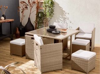Conjunto de mesa y sillas de exterior, ideal para disfrutar de comidas al aire libre con hasta 8 personas. - Mesa con superficie de cristal. - Estructura de ratán. - Incluye asientos y reposapiés.