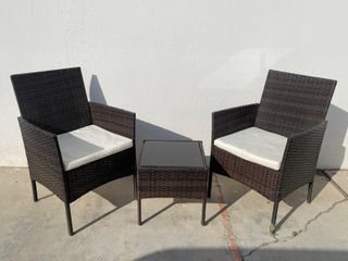 Conjunto de mobiliario de exterior en ratán sintético negro. Incluye una mesa auxiliar con superficie de cristal y dos sillones. Medidas sillas 56cm ancho 50cm fondo 85cm alto Medidas mesa 40cm largo 40cm ancho 39cm alto