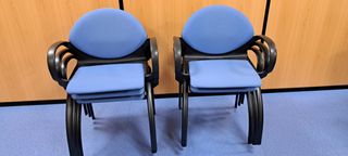 Conjunto de 6 sillas confidente con asas tapizadas en azul y patas de color negro de la marca Steelcase de muy buena calidad. Son sillas apilables, se les puede quitar los brazos. Dimensiones: Ancho 61,5 cm, Largo 45 cm, altura del asiento 46 cm, altura total 80 cm. En perfecto estado. las vendo individuales o en pack a mejor precio. Mesas Sillas con pala, cajoneras, y otros muebles disponibles en mi perfil.