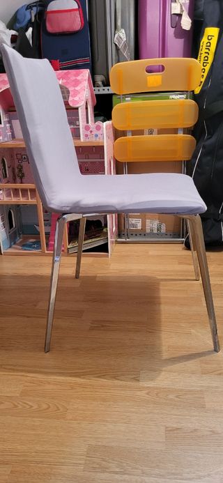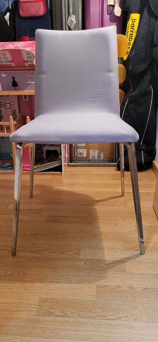 sillas salon fabricante nacional compradas en tienda de muebles. La unidad 85 € . costaron 120€. Tapizado antimanchas en gris . Casi sin uso . Muy buen estado . Sin rotos ni manchas ni roces . Compradas hace 3 años . Se venden por mudanza . Se pueden ver sin compromiso y se escuchan ofertas . Madera muy resistente . preguntar por privado por el precio del pack. Son seis . Se venden en conjunto o por separado