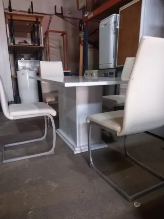 Mesa y cuatro sillas de comedor pintadas en blanco. Las sillas necesitan ser tapizadas. La mesa tiene 90 de ancho x 1.25 de largo, extensible hasta 2m.
