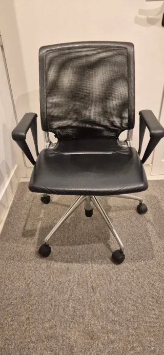 Icónica silla de oficina Vitra, original y en excelente estado. Un clásico del diseño que combina ingeniería y confort. Respaldo: Malla técnica perforada, transpirable y ergonómica. Asiento: Tapizado en cuero negro de alta calidad. Estructura: Aluminio pulido resistente y elegante. Mecanismo sincronizado que se adapta al movimiento. Ideal para teletrabajo o despachos que busquen imagen y ergonomía. Muy cuidada. Precio nuevas 900€. Diseño suizo de alta gama para toda la vida.