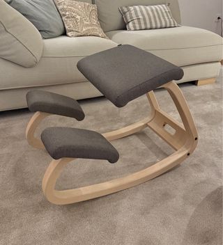 Silla ergonómica de la marca Varier, con un diseño moderno y funcional. - Estructura de madera curvada. - Asiento y soporte para rodillas tapizados en tela gris.