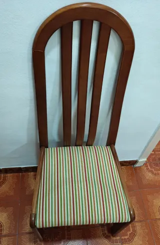 Conjunto de sillas de comedor con estructura de madera y asiento tapizado. 6 unidades - Diseño clásico y elegante. - Tapizado a rayas multicolor. - Patas de madera resistentes.