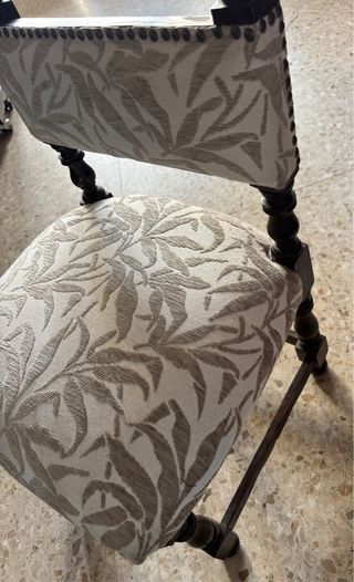 Elegante silla con tapizado artesanal y detalles de tachuelas. - Patas de madera oscura. - Diseño floral en el tapizado.