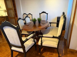 Se vende conjunto de mesa extensible (hasta 250 cm) y 6 sillas comedor clásico. Mesa en muy buen estado. Sillas de madera en buen estado. El tapizado esta bien pero necesita algunos retoques. Sólo recogída, no se hacen envíos. También se vende por separado. Mesa 100€ 6 x sillas 50€