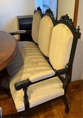 Elegante conjunto de silleria siglo XIX, ideal para coleccionistas de antigüedades. - Sillas tapizadas en tela beige con estructura negra. - Diseño ornamentado característico del siglo XIX. Sofa 150x60 Sillones 60x60 Sillas 50x45 4 sillas dos sillones y sofa